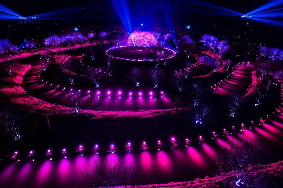 当暮色莅临,日间的素雅梅园一会儿变身流光溢彩的虚幻全国。园区以梅园中心的“梅王”为圆心,在横跨200亩的梅林间铺张开一场阵容盛大的光影盛宴,上千组多色LED帕灯与树灯点亮林间水岸,100瓦激光矩阵与500瓦电脑光束灯纵横交汇,互助上千颗弹球灯点缀其间,在梅溪香岭、梅影曲径、梅宫探梅三大片区铺展出档次丰富的立体光域,整片梅林仿佛被光影再行雕琢。