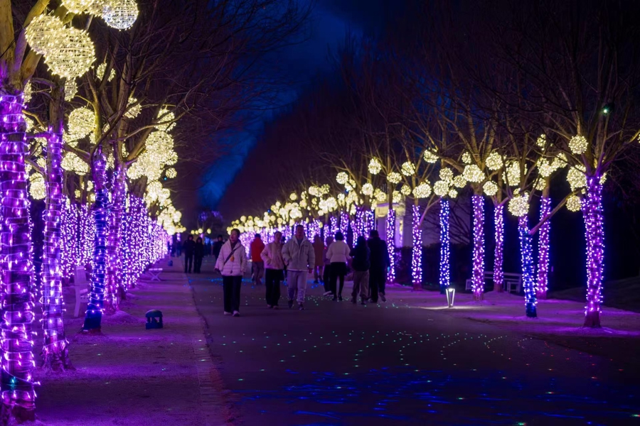 最令东谈主酣醉的是梅林深处的“飞雪映梅”千里浸式幻景。灯光想象师以科技为笔,在夜空中勾画出莹白“飞雪”旋落的抖擞,点点光影如霜似雪,与枝端初绽的梅花交相衬映,在晚风与梅香中铺陈开一幅壮阔而粗放的诗意画卷。