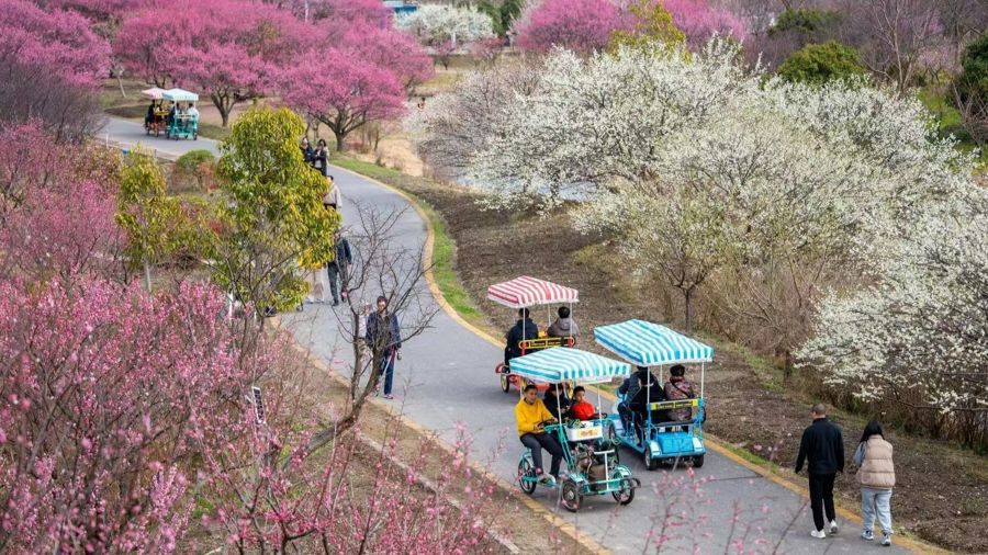 而一项名为“认领梅花添福分”的活动,则让旅客与这片地盘开辟更深层的连接。据了解,旅客认领一棵梅树,可取得包含单东谈主年卡、定制挂树牌、道喜卡、园内游乐券在内的职权包,更有一个避讳福利,认领的梅树可享有往日所结梅子的采摘权。